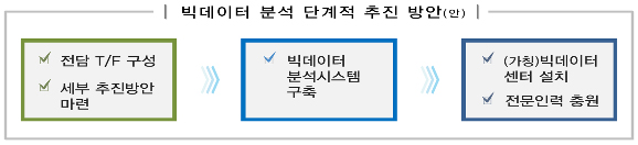 빅데이터 분석은 전담TF를 구성하고 분석시스템 구축, (가칭) 빅데이터센터 설치 순으로 진행된다.