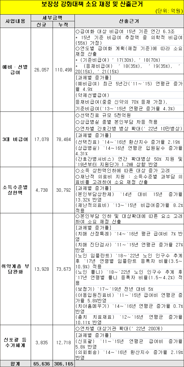 '문재인케어'로 도입되는 예비급여와 약제 선별급여에 향후 5년간 투입될 건강보험 재정은 11조원이 조금 넘는 것으로 추계됐다. 3대 비급여 개선에는 같은 기간 7조8000억원 가량 추가 재정이 필요한 것으로 분석됐다.