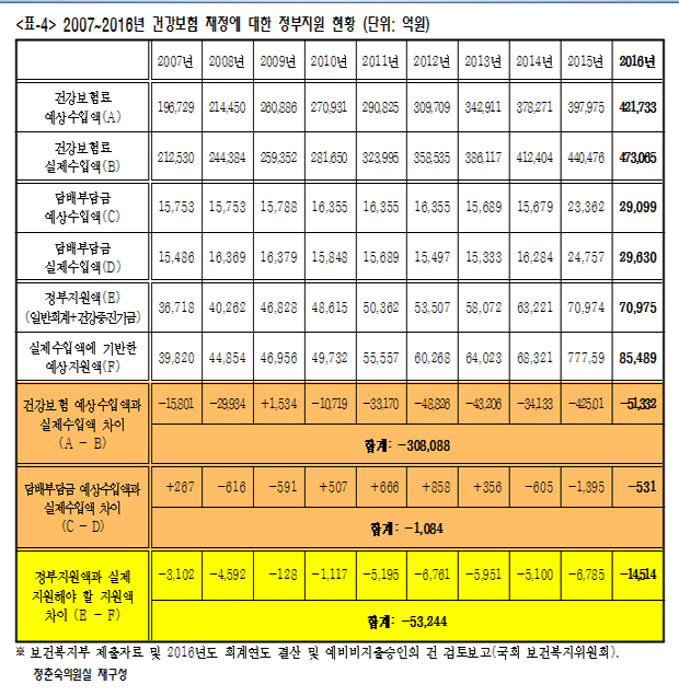 이런 방식으로 지난 10년간(2007년~2016년) 무려 5조3244억원이나 되는 건강보험 재정지원금이 사실상 누락됐다고 덧붙이기도 했다.