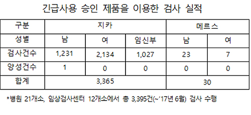 긴급사용 승인 제품은 '우수검사실 신임인증'을 받은 의료기관 중 질병관리본부에 신청해 지정받은 의료기관에서 사용했고, 올해 6월까지 민간 의료기관 21곳과 임상검사센터 12곳에서 총 3365건의 지카바이러스 유전자 검사와 30건의 메르스 유전자 검사를 실시하는데 쓰였다.