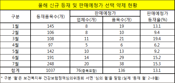 월별로는 3월이 19.4%로 판매예정가 등재율이 가장 높았다. 등재품목수 108개 중 21개가 판매예정가였다. 이어 7월과 6월이 각각 15.3%, 15.2%로 뒤를 이었다.
