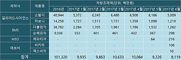 애브비의 ' 비키라/엑스비라(리토나비르/옴비타스비르/파리타프레비르/다사부비르)'가 급여권에 진입한 6월에는 50억원대로 큰 폭의 하락세를 보이고 있다.