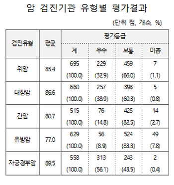 암검진 평가의 경우 영상의학·진단의학·병리학·내시경학·출장검진·질병예측도·기록의 7개 평가분야로 구성됐다. 평가 결과 평균점수는 자궁경부암이 높고, 유방암이 낮았다. 평가등급은 자궁경부암이 우수등급 비율이 높고, 그 외 4개암 모두 보통, 우수, 미흡등급 순으로 나타났다.