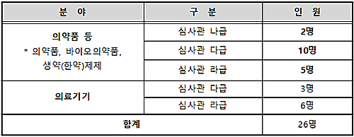 의료기기를 제외한 지원 가능 분야 인원은 총 17명으로, 국내 시판을 가름할 허가·심사 자료를 검토할 핵심 전문 인력이다.
