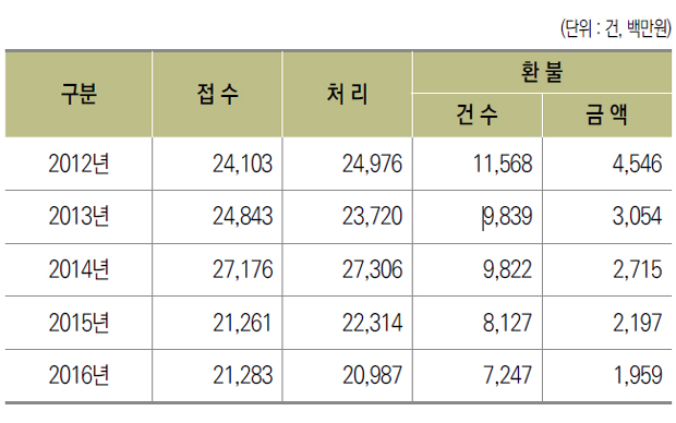 환불결정 건수는 7247건, 환불금액은 19억5900만원이었다. 접수건수는 2012년 2만4103건에서 2013년 2만4843건, 2014년 2만7176건으로 늘었다가, 2015년 2만1261건으로 급감했고, 지난해 비슷한 수준을 유지했다.
