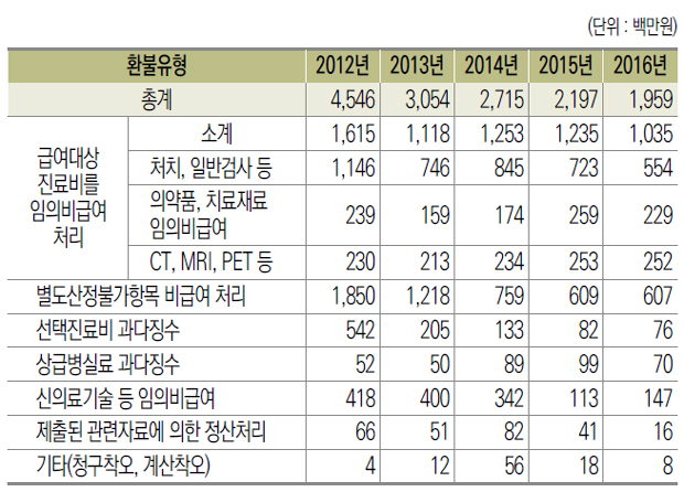이어 선택진료비 과다징수 6억700만원, 별도산정불가항목 비급여 처리 2억5200만원, 신의료기술 등 임의비급여 1억4700만원, 선택진료비 과다징수 7600만원, 상급병실료 과다징수 7000만원, 제출된 관련자료에 의한 정산처리 1600만원, 기타(착오청구, 계산착오) 800만원 등의 순으로 뒤를 이었다.