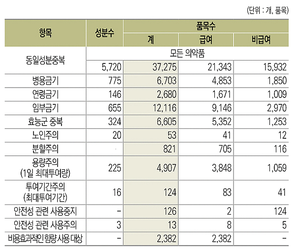 이어 임부금기는 1만2116품목이 점검을 받았으며, 병용금기의 경우 6703품목, 용량주의 4907품목이 DUR 점검을 받았다. 비용효과적인 함량 의약품(저용량 배수처방) 점검은 2382품목으로 나타났다.