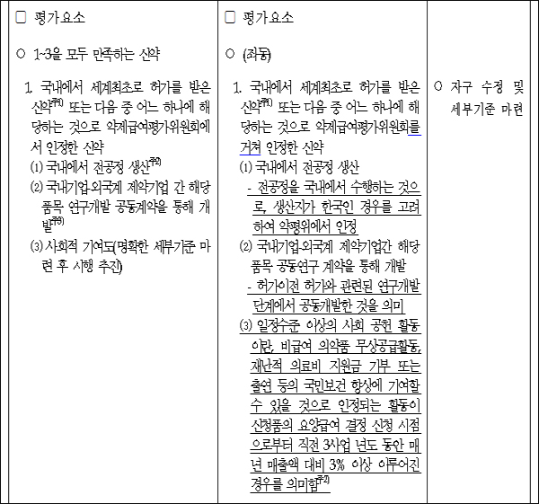 여기서 일정수준 이상의 사회 공헌 활동은 '비급여 의약품 무상공급활동, 재난적 의료비 지원금 기부 또는 출연 등의 국민보건 향상에 기여할 수 있을 것으로 인정되는 활동이 신청품의 요양급여 결정 신청 시점으로부터 직전 3사업 년도 동안 매년 매출액 대비 3% 이상 이뤄진 경우를 의미한다'는 내용도 명문화했다.