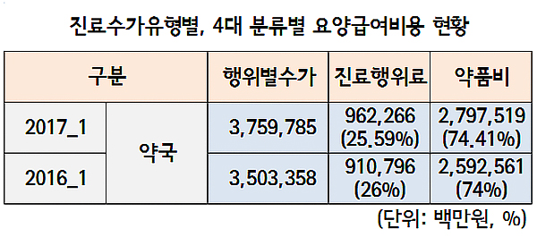 3년 전인 2015년과 비교하면 약품비는 9%, 조제행위료는 12% 중가했다. 조제행위료 증가폭이 높은 건 수가인상 등이 반영된 결과로 풀이된다.