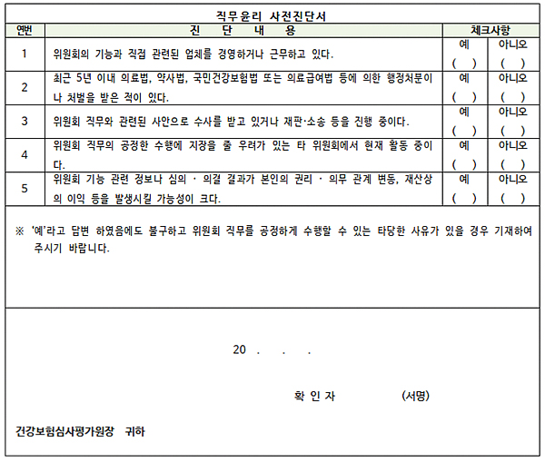 개정안에 따르면 위원 후보자는 별지 제1호서식의 직무윤리 사전진단서를 작성해야 하고, 심평원장은 사전진단 결과에 따라 위원으로서 직무 적합성 여부를 확인한 후에 위촉해야 한다.