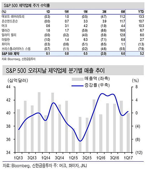 증권가에 따르면 애보트와 마일란, BMS, 일라이 릴리, 엘러간, 존슨앤존슨, 머크, 화이자 등 S&P 500 8개 제약사들의 1분기 합산 매출액은 627억 6400만 달러로, 전년 동기(595억 3100만 달러) 대비 5.4% 오름세를 나타냈다. 같은 기간 영업이익은 158억 달러로 2.6% 올랐다.